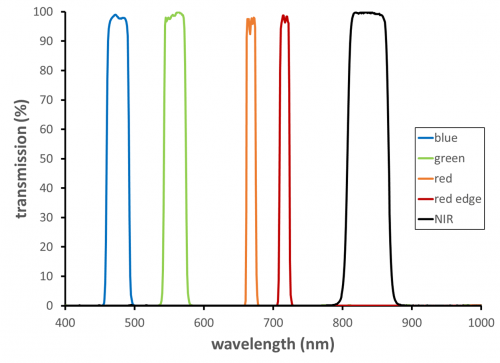 4.光谱滤光片-一般通过对应的带通滤光片:蓝色、绿色、红色、红色边缘和近红外进行标准化差异(示例如下)。另一种选择是使用线性可变带通滤波器,它的带通随滤光片一维方向的变化而变化,可以提供类似“彩虹”的滤光效果。这种滤光片在相机上产生光谱,从而实现多光谱成像。