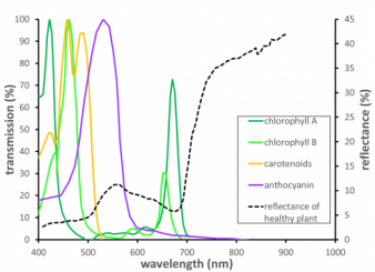 植物中常见的色素包括主要的叶绿素A和B,它们赋予植物绿色,但也包括不同数量的类胡萝卜素和花青素。反射光谱在波长被吸收的位置下降。